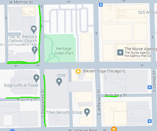 Evening and Weekends Parking is Free On: East side of Jefferson between Quincy and Adams. North Side of Adams past Des Plains and before 90/94 Bridge East Side of Des Plaines, between Adams and Monroe after 7 pm and all weekend. (Right across St. Patrick’s Church and the park)